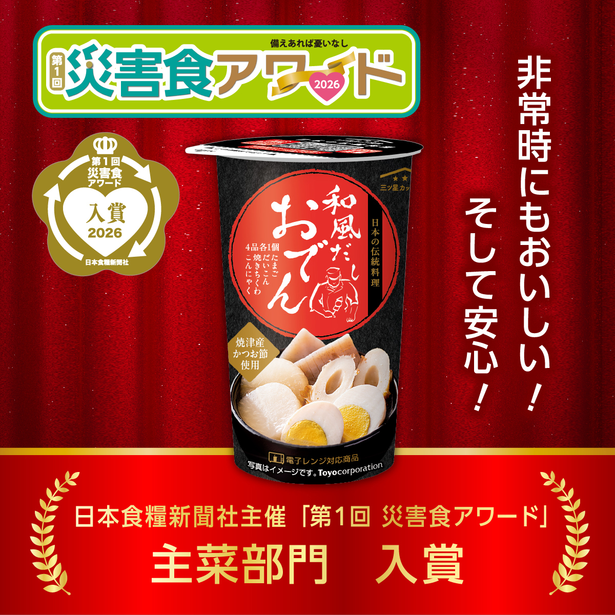 日本食糧新聞主催の災害食アワード において、三ツ星カップ食堂シリーズ「和風だしおでん」が、主菜部門で入賞しました。